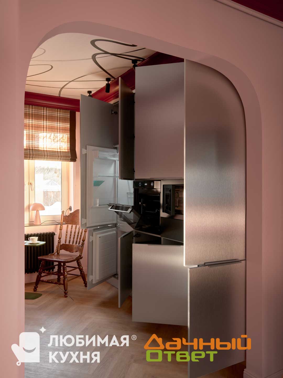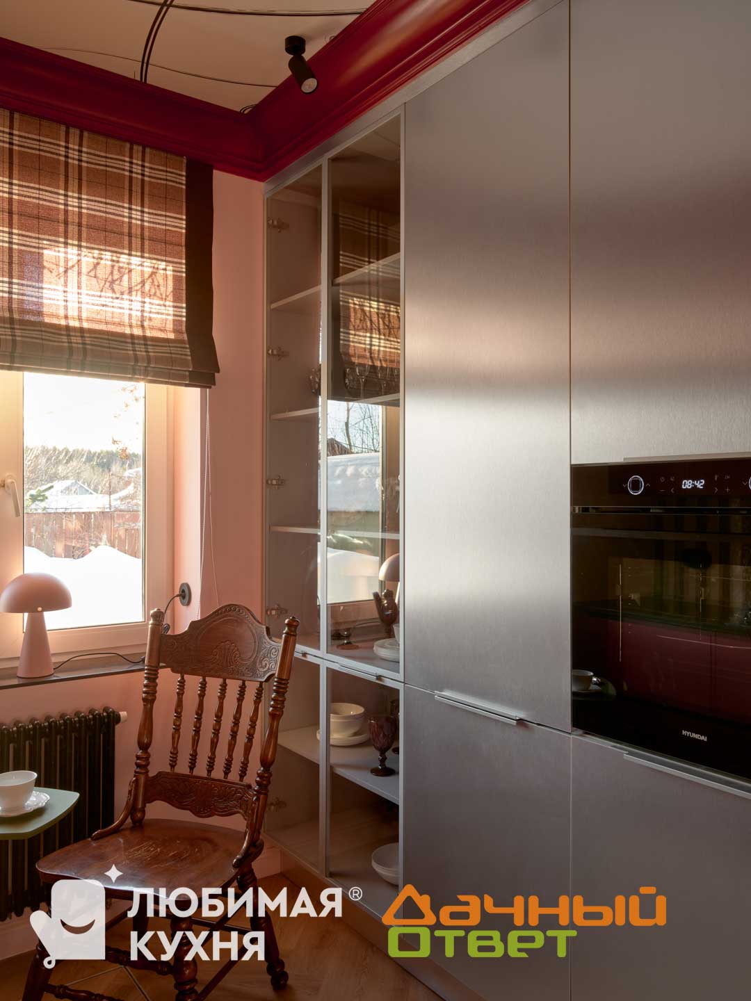 Стену напротив займут высокие пеналы. Их корпуса – из ДСП с ламинацией «Серебро чукотское дымчатое». Один из пеналов дополняем стеклянными распашными дверцами в алюминиевых рамках. Остальные фасады тут – металлизированные, из коллекции Scalar. Декор – Satin Silver. Все панели для мебели сделаны в Санкт-Петербурге.