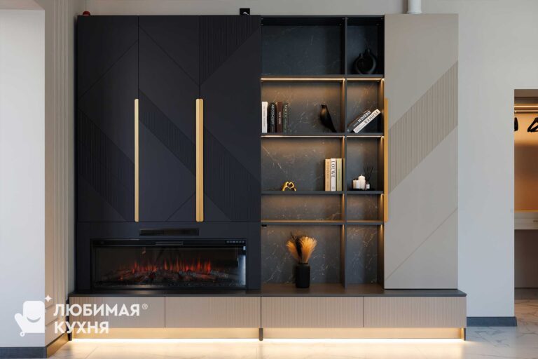 Элегантная мебель для санузла в неоклассическом стиле с фасадами мягкого кремового оттенка. Встроенный шкаф-пенал с фрезерованными фасадами скрывает инсталляцию и обеспечивает вместительное хранение. Контрастная тумба под раковину с рифленым фасадом и столешницей из чёрного мрамора с белыми прожилками создаёт изысканный акцент. Настенные полки с тёплой подсветкой за тонированным стеклом добавляют глубину пространству. Золотистая фурнитура, смеситель и аксессуары подчёркивают премиальный характер интерьера.