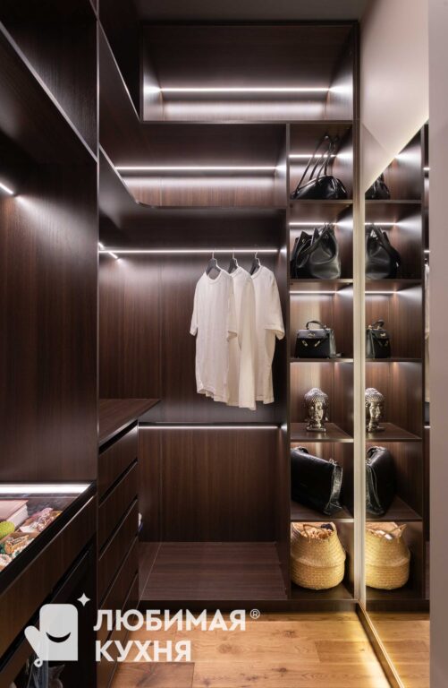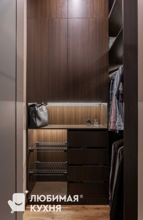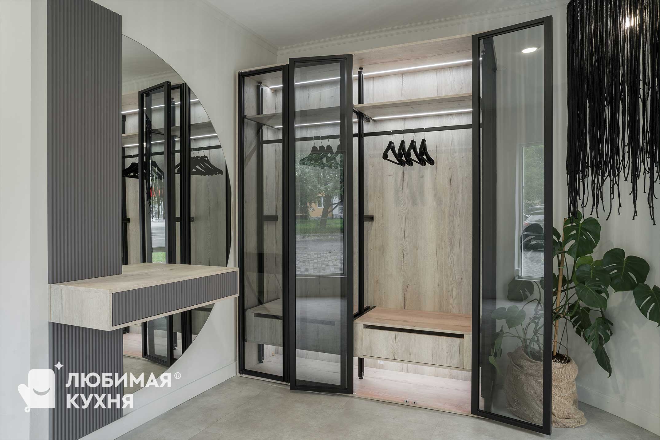 Комплект мебели в прихожую — подвесная тумба с зеркалом, стеновыми панелями и воздушным шкафом. Шкаф продуман для размещения верхней одежды на плечиках, а так же оборудован выдвижными ящиками. Подсветка обеспечивает отличный обзор всего содержимого, в таком шкафу вы не потеряете ни одну вещицу!